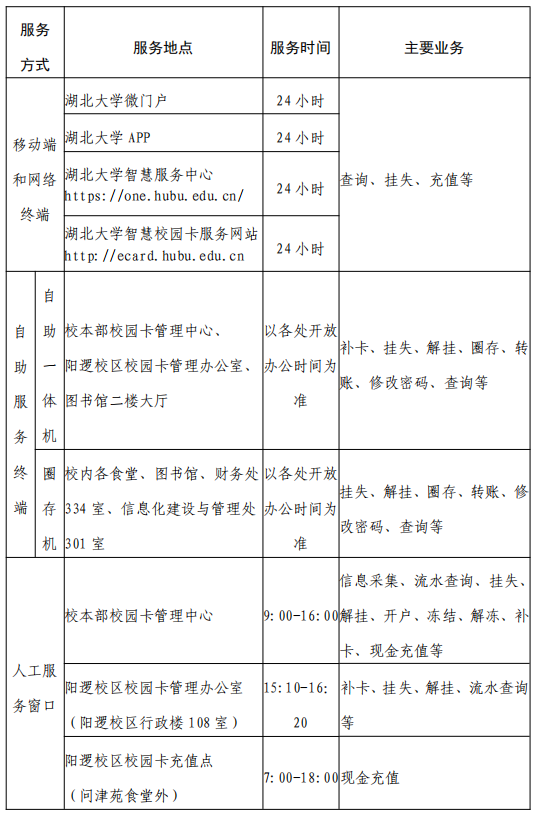 校园卡业务可通过移动端和网络终端、自助服务终端、人工服务窗口3种方式办理,具体服务地点及业务类型详见下表: