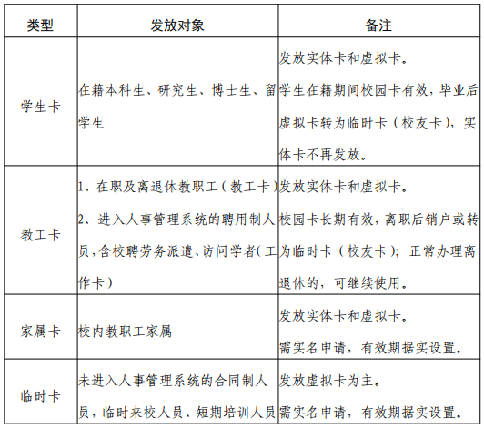 智慧校园卡有4种类型:学生卡、教工卡、家属卡和临时卡。