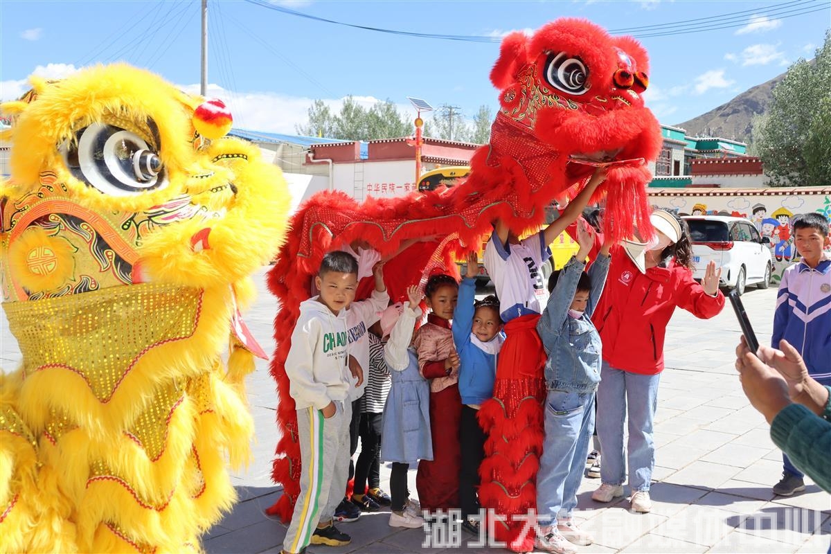 “小朋友们跟紧咯!我们要加速啦!”在支教团成员刘晓敏的邀请下,几位小朋友钻到醒狮和长龙身下,加入到舞龙狮的队伍中。伴随着音乐,支教团与舞龙队成员一起,带着孩子们将长龙摆成蝴蝶结、数字等造型。