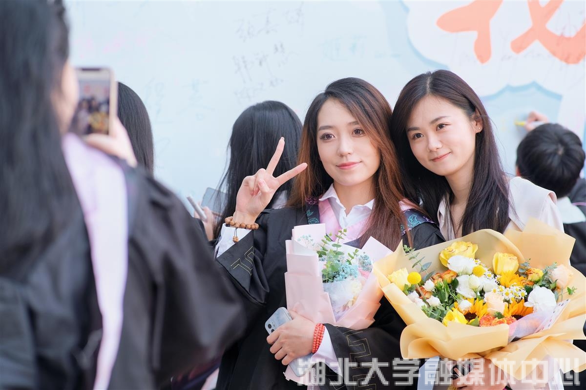 毕业生们纷纷在现场设置的打卡框合影,边框设计富有学院特点和青春气息,既有和专业相关的相机、话筒等图案,也有温馨的励志话语:“在夏天认识的人,要在夏天说再见啦!我们都将成为更好的大人。”