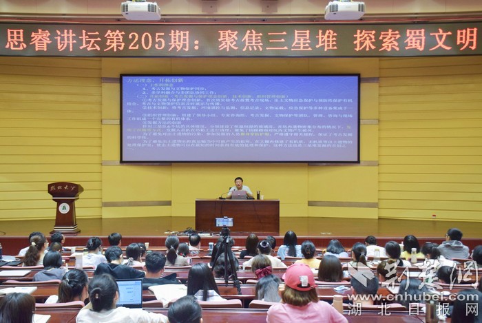 王巍从上世纪二三十年代位于四川省广汉市的三星堆遗址发现讲起,介绍了1、2号坑的发掘情况,以及之后持续进行的考古发掘。他重点对六座祭祀坑的发现和发掘情况进行讲解与分析。他表示,三星堆3到8号坑的发掘,使考古界再掀高潮。而这些新的考古发现离不开考古人员开拓创新的方法理念以及科技进步提供的支持。