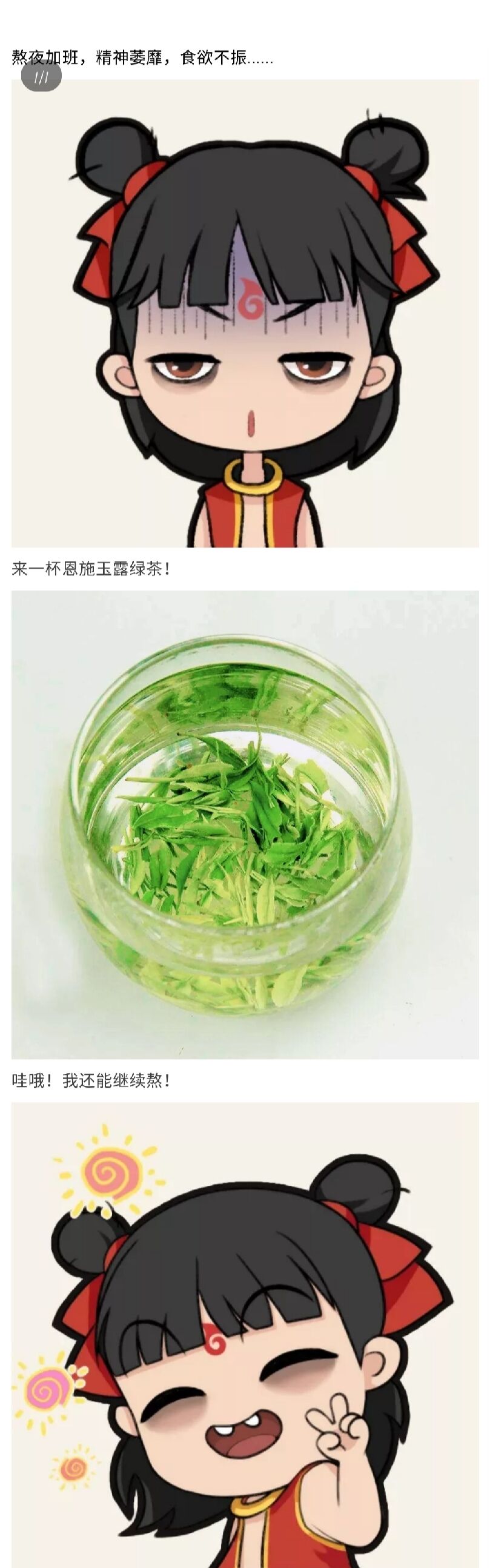 提神醒脑的玉露茶饮品、消痘补水的玉露牌面霜、瘦身减脂的玉露牌减肥茶……这些都是张宁为恩施玉露茶设计的相关营销产品。她借用微信推文长图的形式,搭配上流行的漫画元素,并使用“玉露牌”茶产品前后的对比图,简明扼要地刻画出玉露茶富硒优势中,符合现代人日常需要的高效、便捷等特性。