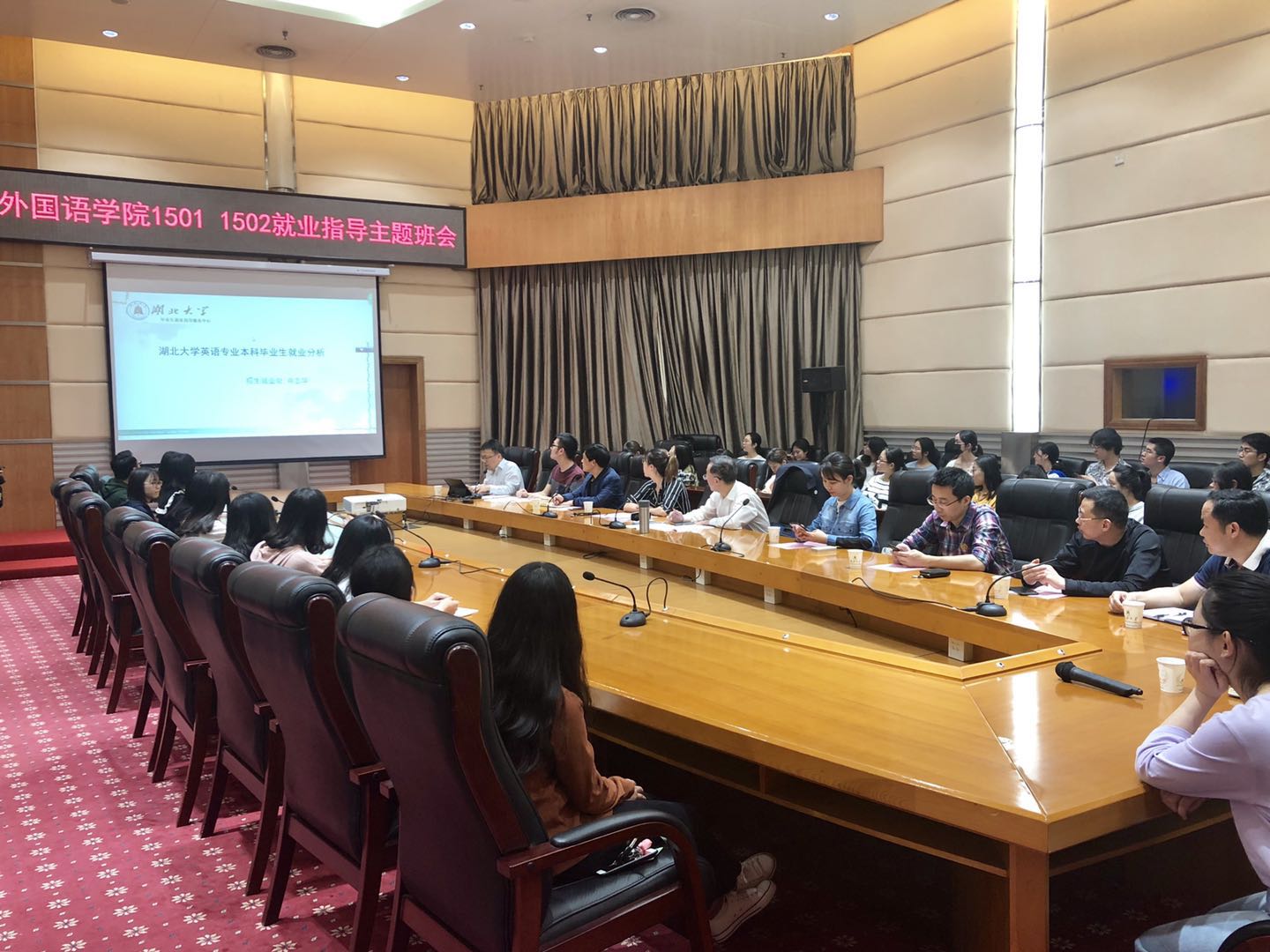 班会现场,招生就业处副处长肖志华从第三方数据和学校往届毕业生就业为大家分析道,“英语专业就业前景较好,需求较大,大家要树立信心。”湖大外国语学院校友牛晓菲结合自身创业经历说,“选择固然重要,但发展自己、了解自己更加重要。”英语专业本科毕业后赴泰国参加志愿活动,后回校求学就业的闫超与大家分享了自身发展经历,嘱咐大家珍惜时间、把握机会、勇敢拼搏。