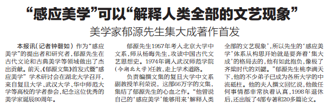负责编撰文集的复旦大学中文系副教授羊列荣说,这部66万字的文集,集结了郁源先生的心血之作。“他曾说自己的‘感应美学’能够用来‘解释人类全部的文艺现象’,所以先生的‘感应美学’体系从构思开始就是要奔着‘集大成’的格局去的,他有如此抱负,像极了齐梁时代的刘勰。”郁源先生桃李满天下,他的不少弟子已成为各所大学的中流砥柱。他的夫人撰文回忆说,他做任何事情都非常执着认真,1998年退休后,还出版了4部专著和20多篇论文。