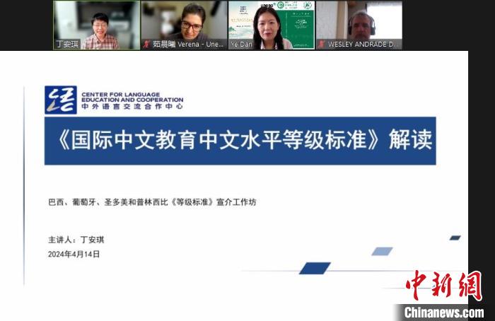 中新网巴西利亚4月19日电 (叶丹)日前,由巴西圣保罗州立大学孔子学院在线举办《国际中文教育中文水平等级标准》(以下简称《等级标准》)葡语版发布仪式暨葡语国家“等级标准”工作坊。来自葡萄牙、巴西和圣多美和普林西比等葡语国家的本土中文教师、国际中文教师、志愿者和中文学习者参加。